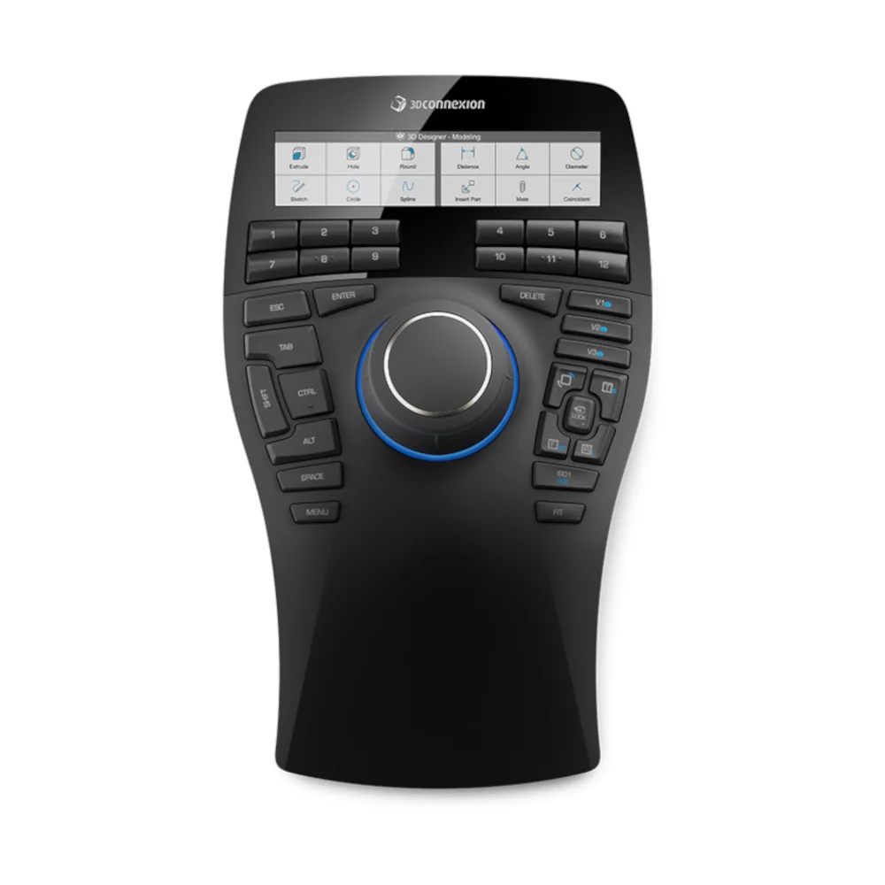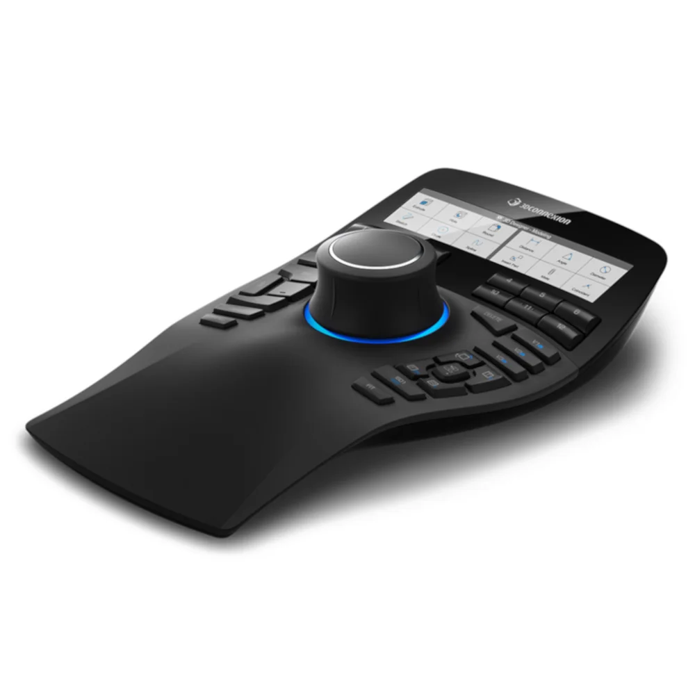 Na wyświetlaczu LCD manipulatora 3D SpaceMouse Enterprise widoczne są ikony aplikacji: SOLIDWORKS, Inventor, Siemens NX, CATIA, PTC Creo, Solid Edge.