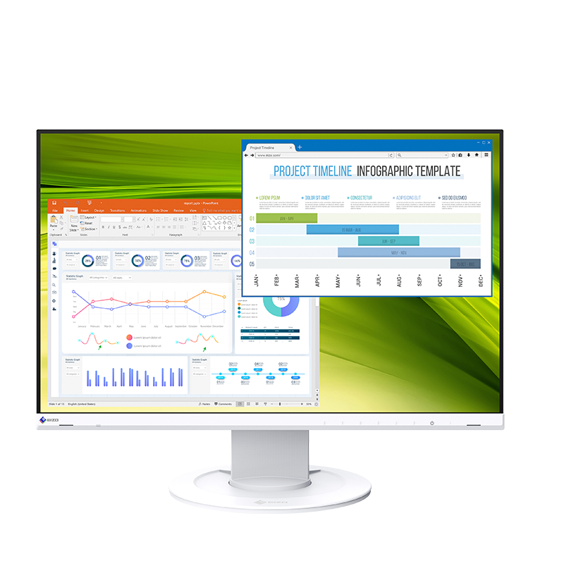 EV2360 wyposażono w panel IPS o przekątnej 22,5″ – najmniejszej spośród wszystkich bezramkowych modeli EIZO. Monitor ma rozdzielczość full HD (1920 x 1200) i szerokość zaledwie 499 mm, dzięki czemu zajmuje niewiele miejsca na biurku. Ekran pokazuje 11% więcej danych niż typowy monitor w rozdzielczości full HD, co uwalnia użytkownika od konieczności uciążliwego przewijania dokumentów.