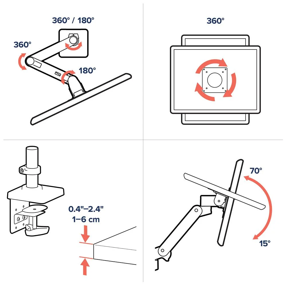 | Zawartość zestawu | Ramię, przedłużenie, uchwyt monitora, zacisk do biurka, słupek 13,1 cm, śruby montażowe (grommet opcjonalnie) |