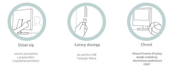 Podstawka i360 pozwala nie tylko na łatwość wymiany informacji na ekranie, ale przyczynia się także do podwyższenia pozycji komputera, a dzięki szerokiej podstawie zapewnienia mu stabilność. Znacznie ułatwiony jest również dostęp do wszystkich portów USB iMaca. Dodatkowo i360 posiada białe, charakterystyczne wykończenia, które doskonale pasują do stylizacji monitorów Apple.