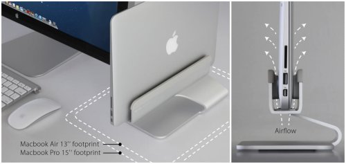 Pionowa podstawka mTower zajmuje około jedną trzecią miejsca jakiego potrzebuje sam laptop, a dodatkowo działa jak gigantyczny radiator, pozwalając na wydajniejsze rozproszenie ciepła emitowanego przez MacBooka.